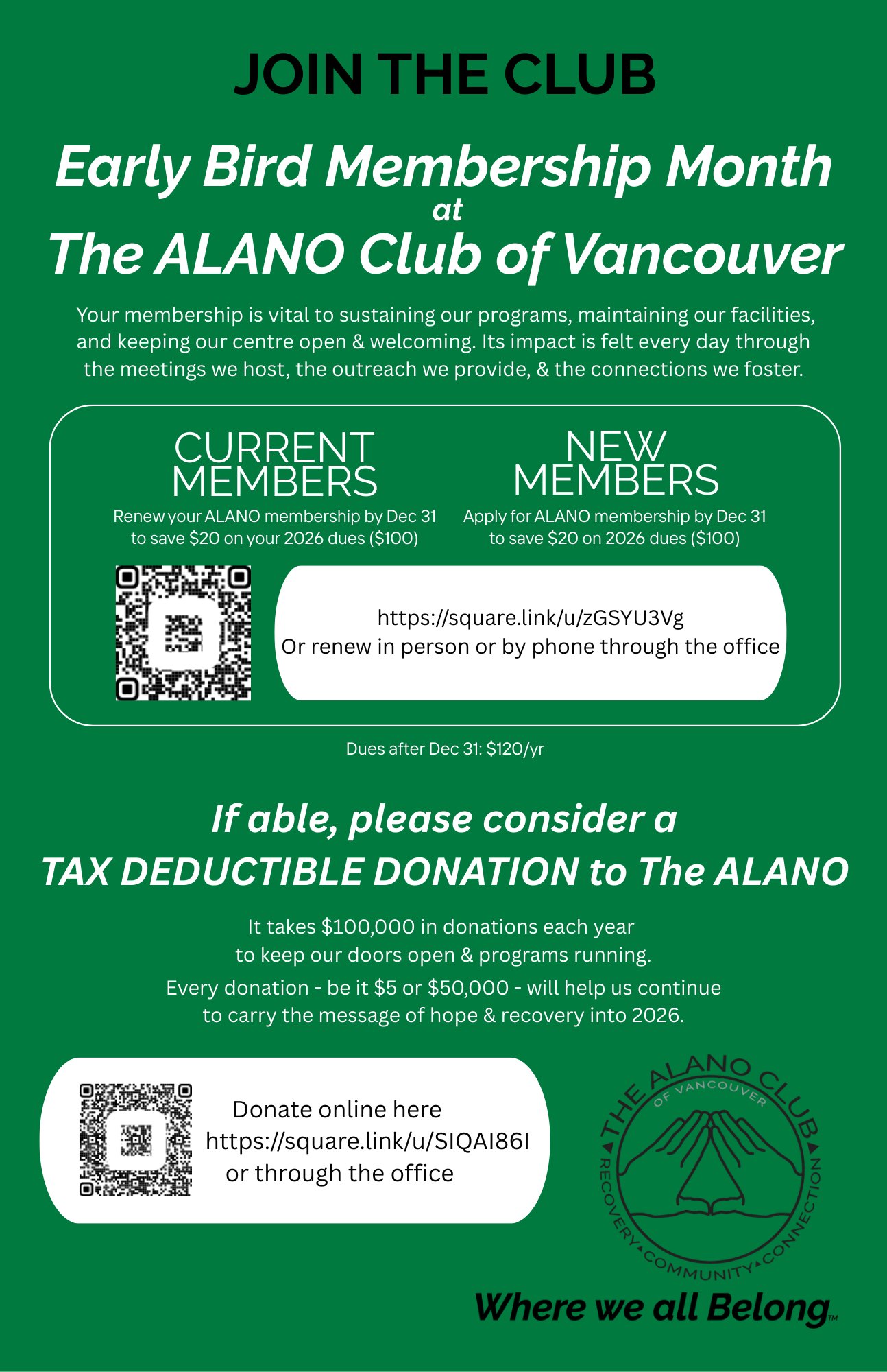 Become an ALANO Club of Vancouver *MEMBER or DONOR